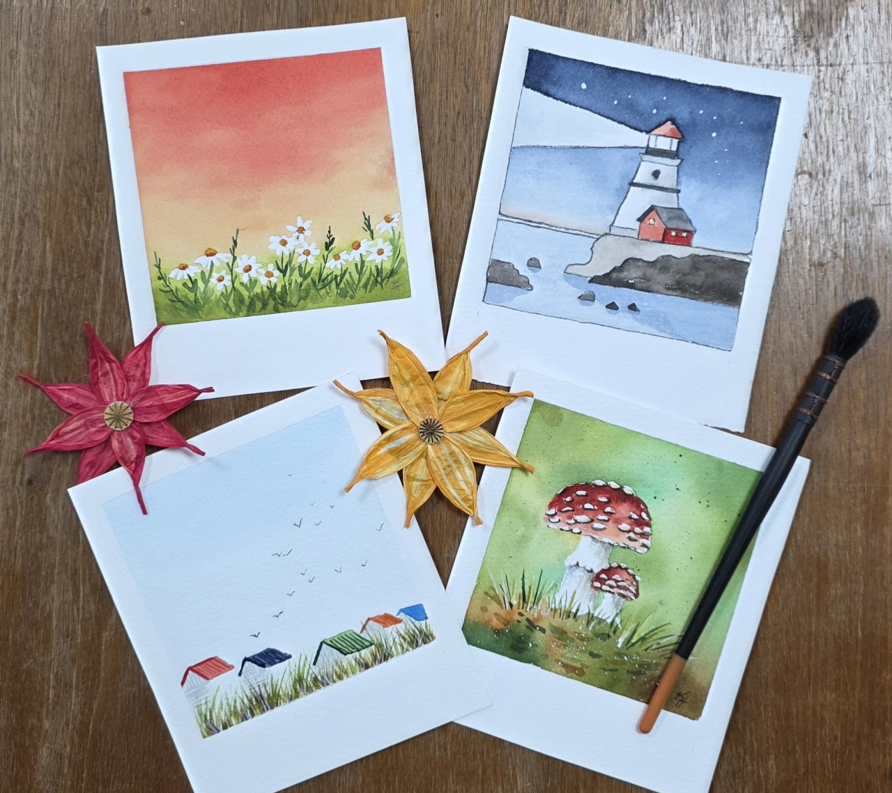 Am 2. Februar malen wir erneut Mini-Aquarelle im Polaroid-Stil. Ich stelle wieder mehrere Motive zur Wahl und wir malen so viele wie wir schaffen (das Bild zeigt nur eine Auswahl).